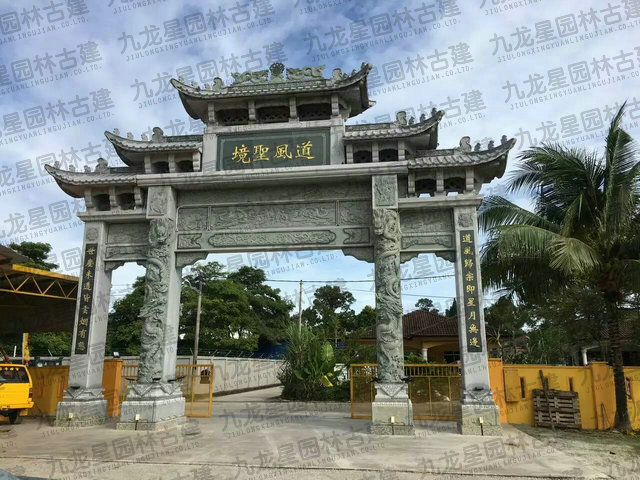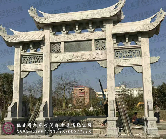 牌坊集中了中國(guó)古建筑最有特征的構(gòu)件組成,有臺(tái)座、柱身(包括夾桿石)、梁坊、樓匾、斗拱、樓頂?shù)葮?gòu)件。石造牌坊材質(zhì)堅(jiān)固敦實(shí)牢靠,且可仿照木結(jié)構(gòu)造型。在藝術(shù)處理上,可以在夾桿石、柱子、額坊等處,雕刻各式各樣的花鳥、圖案、龍鳳及各種瑞獸等等,將中國(guó)傳統(tǒng)的石刻藝術(shù)集中于一身表現(xiàn)出來(lái)。中國(guó)民俗專家講:“石雕不開光是石雕工藝品,開光后就是具有靈氣的風(fēng)水神器?!彼浴胺菍?kù)o無(wú)以致遠(yuǎn),非精誠(chéng)無(wú)以神明?!?石牌坊是用石修建的牌坊,是一種裝飾建筑物。柱石的上方刻有麒麟、獅子,夾柱石的浮雕有雙獅戲彩珠,牌坊上還雕刻著其他怪獸云紋。兩側(cè)基石柱各有撐鼓,石柱兩側(cè)配有石獅。牌坊運(yùn)用浮雕、透雕等手法,是我國(guó)建筑藝術(shù)的一大特色。