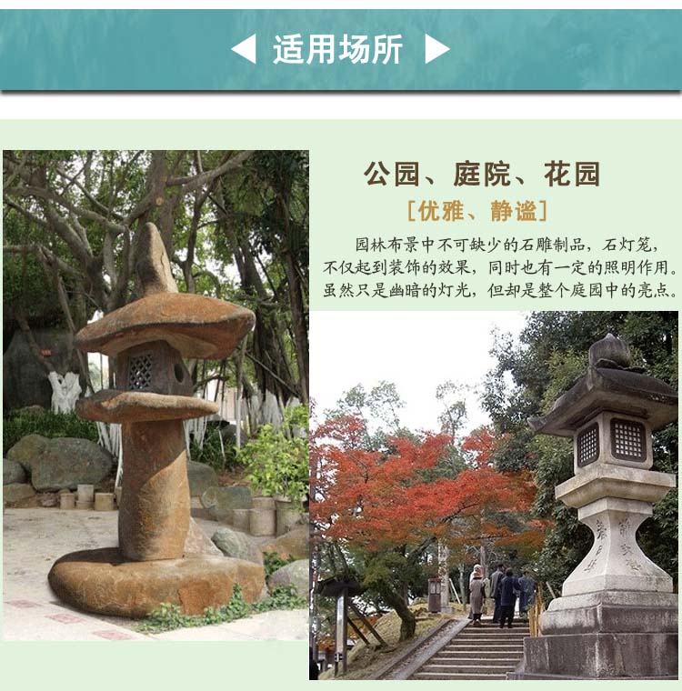 石燈籠是日本石文化的重要內(nèi)容之一,也是近年來(lái)我國(guó)出口日本石制品的一個(gè)重要品種。石燈籠在日本有著非常悠久的歷史。在佛前獻(xiàn)燈火是佛教的重要禮儀之一,自奈良時(shí)代 (公元 710~ 794年 )起日本在修建寺院時(shí)就開(kāi)始在寺院的正面建造石燈籠以保護(hù)向寺院所獻(xiàn)的燈火。日本現(xiàn)存的最古老的石燈籠是奈良時(shí)代的當(dāng)麻寺石燈籠,距今已有一千多年的歷史了。到了江戶(hù)時(shí)代 (公元 1603~ 1867年 )石燈籠在日本已廣為流傳,一些寺院里造型精美的石燈籠被作為樣本模仿雕刻以至形成了石燈籠的各種形式。石燈籠被用于園林、庭院的裝飾始于十六世紀(jì)晚期的安土桃山時(shí)代,當(dāng)時(shí)由于茶道的大發(fā)展,石燈籠常被作為茶室的一種露天裝飾物而廣泛進(jìn)入庭院裝飾。隨著石燈籠用途的改變,石燈籠的樣式也就更加多樣化了,例如出現(xiàn)了三腳或四腳的雪見(jiàn)燈籠,同時(shí)對(duì)竿和笠的部分也給予新的設(shè)計(jì),石燈籠的式樣由模仿進(jìn)入創(chuàng)新。現(xiàn)在日本的石燈籠除了少量用于寺院神社以外,大多數(shù)的石燈籠是用于庭院、園林裝飾使用。