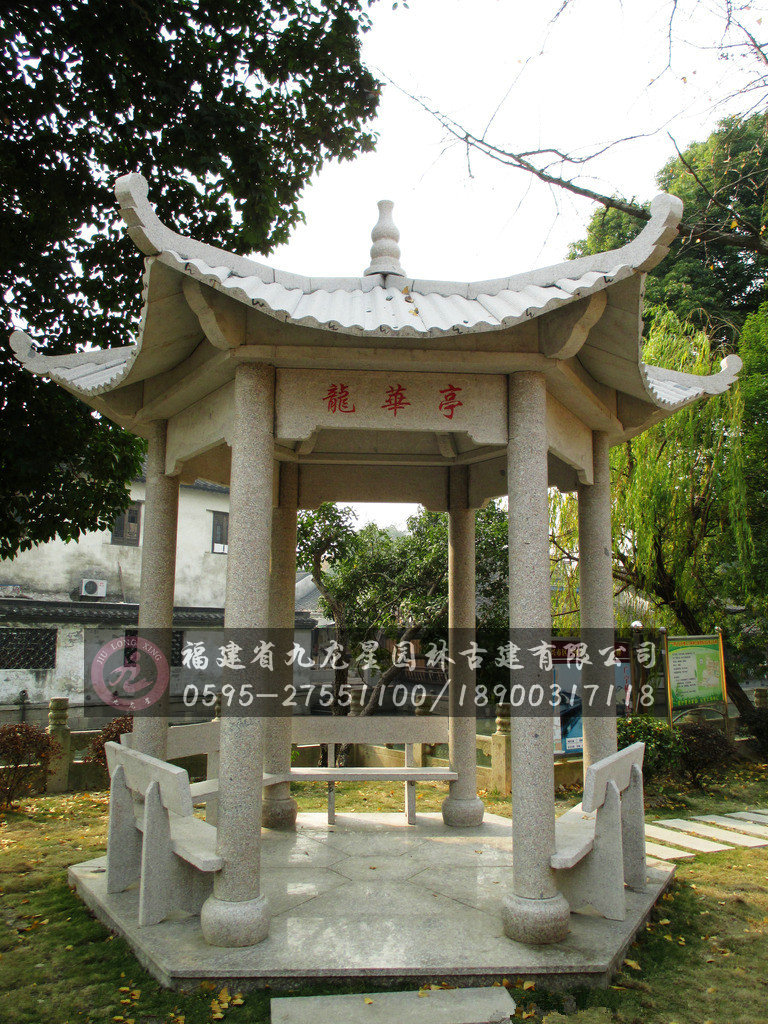 石雕涼亭是指用石頭加工而成的亭子,多建于路旁,供行人休息、乘涼或觀景用。石雕涼亭體量小,平面嚴(yán)謹(jǐn)。自點(diǎn)狀傘亭起,由簡(jiǎn)樸而龐大,根本上都是規(guī)矩多少形體,或再加以組合變形,沒(méi)有圍墻。