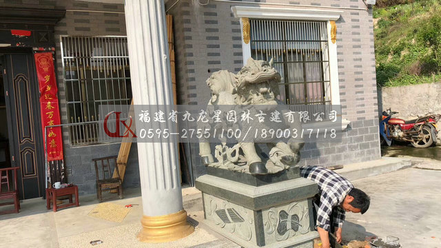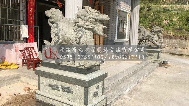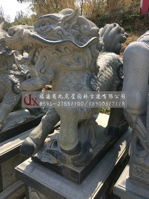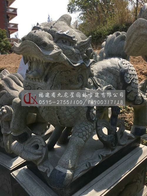 麒麟造型中石刻麒麟多在建筑、皇家建筑里出現(xiàn),其體型巨大,多以威武雄健之態(tài)出現(xiàn)。這說(shuō)明,麒麟造型的比例尺寸大小是與特定的環(huán)境、風(fēng)俗、情感相聯(lián)系的。石雕麒麟的大也可以解釋為大氣、圣威、權(quán)利,具有震懾的作用。石雕麒麟的造型遵循著傳統(tǒng)文化審美的習(xí)慣,麒麟的造型特征說(shuō)明其造物意象充滿了對(duì)美好與吉祥的期望。石雕麒麟的整個(gè)造型集龍頭、鹿角、獅眼、虎背、熊腰、蛇鱗、馬蹄、豬尾于一身,另外使用添加手法在下頜處加有長(zhǎng)長(zhǎng)的胡須,又添加翅膀,這樣,麒麟可以奔跑,可以飛翔,威武之勢(shì)讓人可望不可及。麒麟體現(xiàn)了古人對(duì)現(xiàn)實(shí)世界的主觀理想與造物的主動(dòng)性,其和龍、鳳一樣成了我國(guó)傳統(tǒng)民族精神的象征。還有,石雕麒麟的擺放一般是成雙成對(duì)出現(xiàn)的,主要因?yàn)槠湓煨椭v究碩大豐滿,還注重陰陽(yáng)相守,忌諱殘缺不全、形單影只,其中寄托了人們“天人和諧”的精神追求,內(nèi)涵獨(dú)特而豐富。