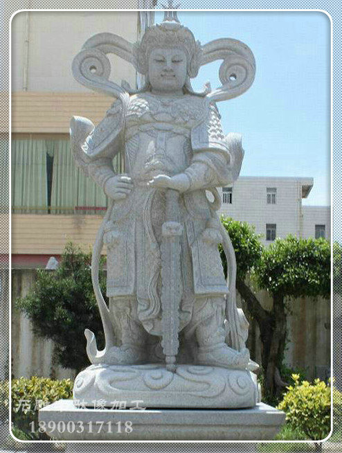 在中國的寺院殿宇里原印度血統(tǒng)的韋馱已經(jīng)被漢化,成了一名地道的中國武將,他身披鎧甲,手持金剛杵,降魔去妖,威風(fēng)凜凜英俊威武。天王殿中所塑的韋馱形象,一般具有兩種站立的姿態(tài):一個是雙手合十,降魔杵橫于腕上,直挺而立;一個是一手握杵拄地,另一手叉腰。前者雙手合十,表示此地是十方叢林,歡迎來客,遠(yuǎn)游的行腳僧可安心住下。后者則示本寺不接待來僧掛單,行腳僧最好另投山門。