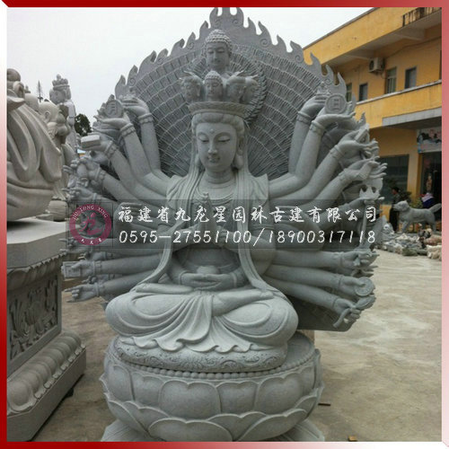 千手觀音菩薩是六觀音之一。全稱千手千眼觀自在,又作千眼千臂觀音、千手圣觀自在、千臂觀音、千光觀自在、千眼千首千足千舌千臂觀自在。據(jù)千手千眼大悲心經(jīng)載,觀自在菩薩于往昔聞廣大圓滿無礙大悲心陀羅尼,為利益一切眾生,乃發(fā)具足千手千眼之愿,而即刻得其身。諸經(jīng)所載形像不一,有身作檀金色,一面千臂者;有身作黃金色,半跏坐于赤蓮花上,十一面四十手,前三面呈菩薩相,本面有三眼,右三面白牙向上,左三面為忿怒相,后一面暴笑,頂上一面現(xiàn)如來相者;有身作金色,千臂千眼五百面者。于密教現(xiàn)圖胎藏界曼荼羅為二十七面千臂,跏坐于寶蓮花上,千手中有四十(或四十二)臂持器杖。又依千光眼觀自在菩薩秘密法經(jīng),千手系表以四十手各濟(jì)度二十五有,故千臂非必具足,但有四十手即可,乃表觀音菩薩廣大慈悲之化用,故多以千臂稱之;且各面各手所代表之功德成就法及印言,亦隨各尊本誓之不同而異。