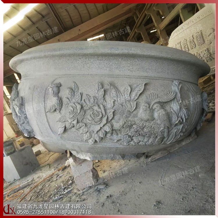 石雕做成的中式石材花缽古樸大方,古香古色,非常適合中式建筑的搭配展示,特別是這種具有現(xiàn)代特色的經(jīng)典傳承文化的創(chuàng)新之作,更是讓人感到耳目一新,并且庭院中擺放這樣的精致雕刻的花缽,在一定程度上提升了整個(gè)建筑的檔次。